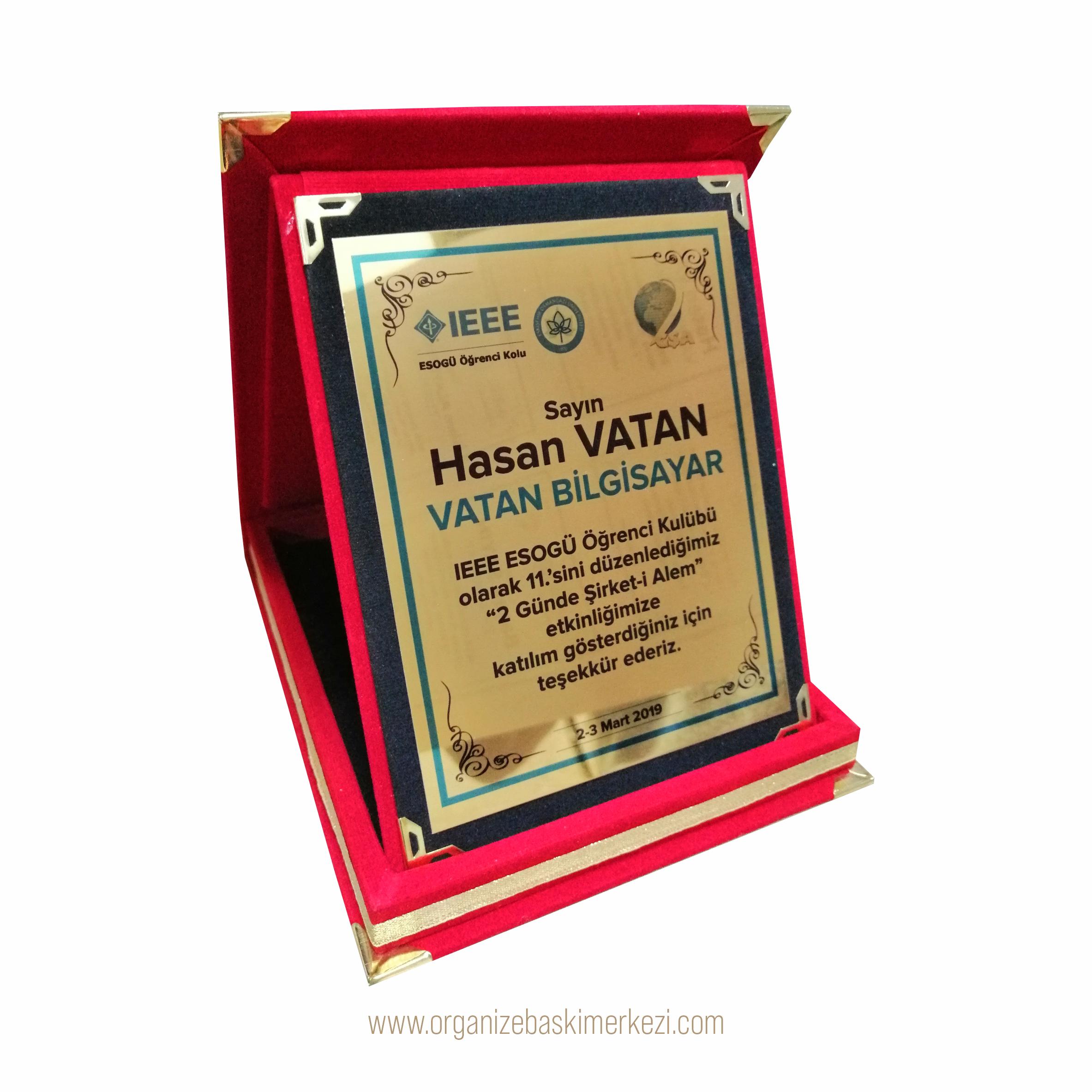 Kadife plaketler de fotoğraf, logo vb. çizimler de yer alabilmektedir.